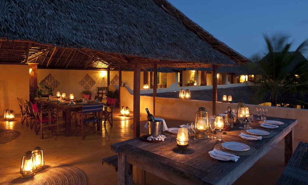 Fünf gut belüftete Ensuite-Schlafzimmer bieten viel Platz für eine Feriengruppe. Die vier Gästezimmer sind im Erdgeschoss, jeweils mit eigener Veranda und herrlichem Meerblick. Eine zentrale interne Baraza-Bereich blickt über die geräumige Veranda, mit großen runden Teak-Esstisch, auf den Ozean und die vorbeifahrenden Dhows. Zwei Treppen führen zu der großartigen, gespiegelten Master Suite; Der Speisesaal, der sowohl abgedeckte und aufgedeckte Essbereich und den wichtigsten Baraza-Bereich mit Bar, Musik und viele leuchtend weichen Kissen.